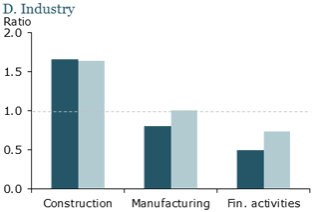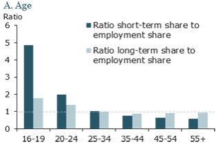 To help you a bit, when the ratio number is above 1 (the faint blue dashed line), that category is over-represented relative to its share of overall employment. To summarize, long-term unemployment as seen in light blue is over-represented in workers under the age of 24, among workers with some college or less and among black, Hispanic and other ethnicities. Short-term unemployment as seen in dark blue is most frequent among younger workers, those who are less educated and those who are black, Hispanic or other ethnicities, very similar to what is seen among the long-term unemployed.