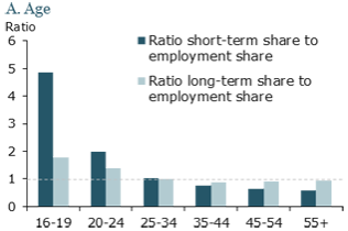 So, who are America's long-term unemployed? Here are a series of bar graphs that look at unemployment duration by age, education, race and ethnicity with each group's incidence of short-term (under 6 months) and long-term (over 6 months) unemployment expressed relative to the overall share of civilian unemployment for that category: