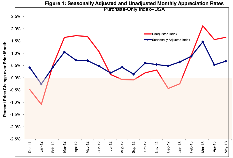 In my opinion, I think that it is likely that the non-seasonally adjusted appreciation rate has shown a sharp climb since the beginning of 2013, largely due to this: