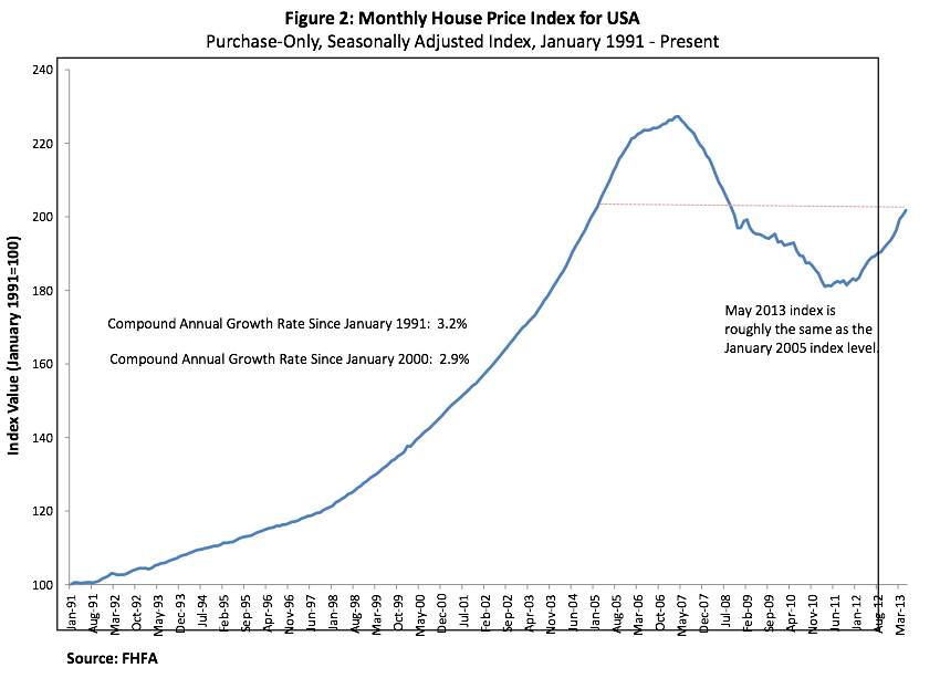 According to the Federal Housing Finance Agency's (FHFA) monthly house price index which is calculated using home sales price information from mortgages either sold to or guaranteed by Fannie Mae and Freddie Mac, U.S. home prices rose by 0.7 percent in the month of May alone. This is the sixteenth consecutive month of house price appreciation adding up to a year-over-year price rise of 7.3 percent. This brings the U.S. index to 11.2 percent below its April 2007 peak and inline with the index level last seen in January 2005 as shown here: