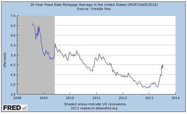 Since January, 30 year mortgage rates have risen from 3.34 percent to a high of 4.51 percent in mid-July 2013, a rise of 1.17 percentage points. While this doesn't particularly seem like much of an increase in raw percentage terms, it is actually a significant rise of 35 percent. For example, on a $250,000 mortgage, the monthly payments on a 30 year mortgage at 3.34 percent are $1100.40. If we increase the interest rate to 4.5 percent, the monthly payments rise to $1266.71, an increase of just over $166 every month. To already indebted home owners, this is a significant increase and will ultimately roll through the economy, taking its toll on consumer spending.
