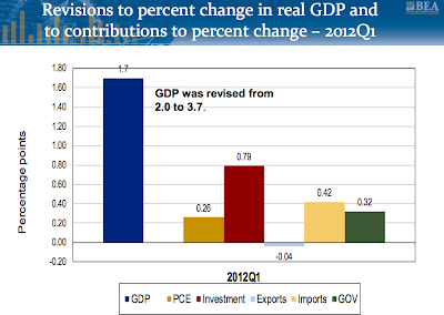 The new and improved GDP for 2012 rose by 2.8 percent rather than the even more pitiful 2.2 percent previously touted by the BEA. The biggest improvement of all was seen in the first quarter of 2012 as shown on this bar graph:
