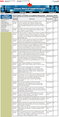 Since Tony Clement is such a big proponent of "openness", let's look at the completed ATI requests for his Treasury Board and see how many of these requests have been partially disclosed or fully disclosed since the beginning of 2013. For your illumination, here's what you see when you click on the "Completed Access to Information Requests" tab on the left side of the page: