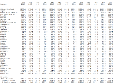 Let's close by looking back in time at the holdings of the number one owner of U.S. Treasuries (after the Federal Reserve, of course). For the purposes of this graphic, I am using China's holdings on December 31 of the years between 2000 and 2012 and the holdings for July 2013: