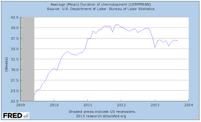 Here is a closeup showing what has happened to the duration of unemployment since the Great Recession officially ended in June 2009:
