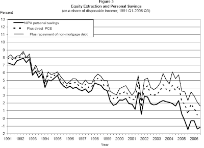 Personal savings (the dark line) dropped into negative territory in early 2005 and remained there until the time that this paper was released in 2007. Yet, this did not seem to overly concern Mr. Greenspan and his band of fellow merry central bankers.