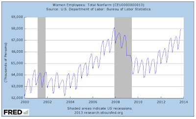 At its pre-Great Recession peak in December 2007, there were 68.109 million women employed in the United States. This quickly fell to a post-Great Recession low of 63.774 million by July 2010, a loss of 4.365 million jobs or 6.4 percent of the pre-recession total. By October 2013, the number of working women had risen back to very nearly its its pre-Great Recession level, hitting 67.952 million. Basically, in just over three years, the number of women working in the United States returned to its pre-recession level.