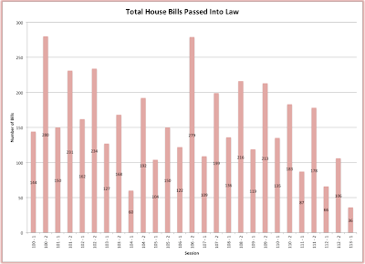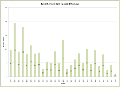 Here is a graph showing the number of bills that have been passed into law by both the House and the Senate for each Session: