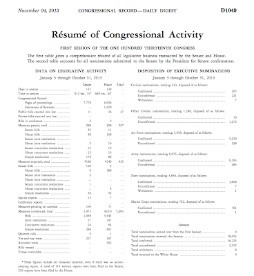 For their 152 days of work thus far in the First Session, the House and Senate managed to pass a total of 47 public bills into law; 11 for the Senate and 36 for the House. While relatively little was accomplished, the Senate created 7779 pages of proceedings and the House created 6958 pages of proceedings. That's a pile of words! According to the Library of Congress, the Congressional Record, a more or less resume ofverbatim account of the proceedings of both Houses of Congress averages about 272 pages every day, making it the world's largest daily newspaper. A total of 5983 measures were introduced; 1638 were bills introduced in the Senate and 3445 bills were introduced in the House.
