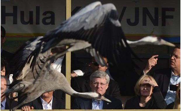 Towards the end of his iconic trip of Israel, Prime Minister Stephen Harper visited several important sites in biblical history, especially where Jesus Christ is believed to have delivered the Sermon on the Mount. Mr. Harper first went on to visit the Hula Valley, where the visitors’ centre a bird sanctuary that is being built and named in his honour. Both Mr. and Mrs. Harper entered the tourist park packed with thousands of cranes that filled the air with high-pitched caws.