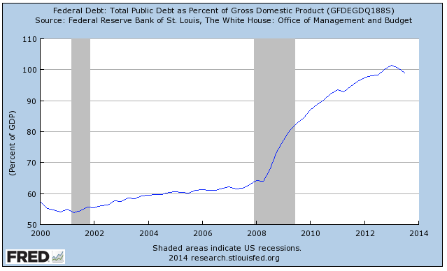Between the beginning of 2000 and the middle of 2007, the debt-to-GDP ratio hovered between 60 and 62 percent. This ratio has risen alarmingly since the beginning of the Great Recession, and is now sitting at 98.97 percent, just below its peak of 101.4 percent in the first quarter of 2013. To say that the current debt level is in the danger zone is an understatement. Keep in mind that part of the levelling off in the debt-to-GDP ratio is due to an expanding economy and part is due to cuts in spending, thanks to sequestration. If economic growth begins to slow down or the economy begins to contract, unless Washington makes meaningful cuts to spending, the debt-to-GDP ratio will once again begin its march toward the heavens.