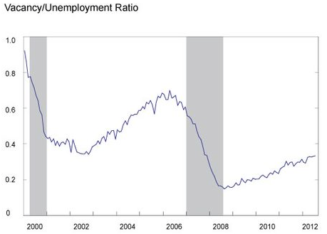 Here is a graph showing the job vacancy-to-unemployment ratio (v/u):