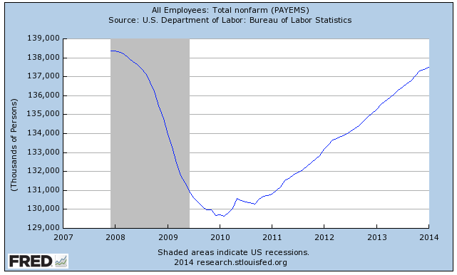 At the beginning of the recession in December 2007, there were 138.35 million non-farm workers, dropping to a low of 129.665 million in February 2010, a loss of 8.685 million non-farm jobs. Since then, the number of non-farm workers has risen to the January 2014 level of 137.499 million, still 900,000 short of the pre-recession level but still a fairly reasonable improvement unless one considers the new entrants into the job market who have fewer jobs to compete for.
