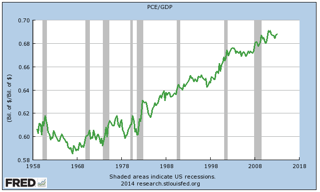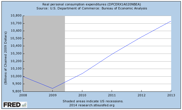 Note that real consumer spending fell to $9.843 trillion in 2009 but has risen by 9 percent to its current level of $10.728 trillion, a new high.