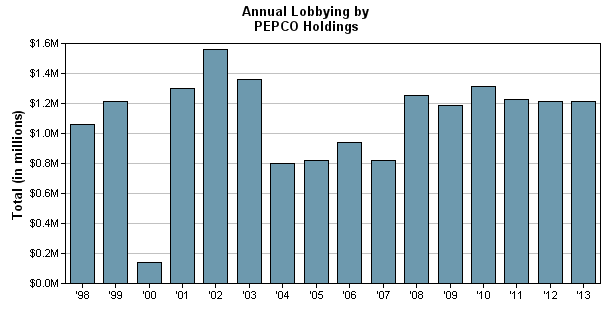 On total profits of $169.504 billion, these 26 companies received tax rebates of $8.676 billion. Pepco Holdings, a mid-Atlantic energy delivery company headquartered in Washington, D.C., had the lowest tax rate among the 288 companies in the study, coming in at negative 33 percent over the five year period. As an aside, it's interesting to note that Pepco is a substantial lobbyist as shown on this chart: