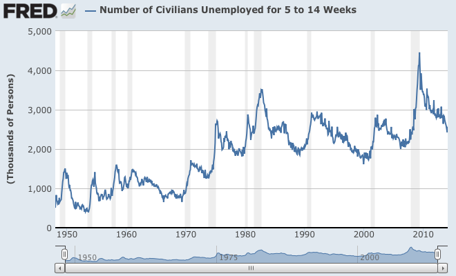 In contrast, as shown on this graph, the number of civilians unemployed for 5 to 14 weeks (the short-term unemployed) is very close to normal levels looking back to the mid-1970s: