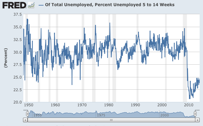 Here is a graph showing the percentage of total unemployed Americans that have been unemployed for 5 to 14 weeks: