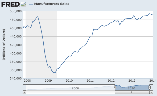 In January 2014, manufacturers' sales reached $490.67 million. At its peak in July 2008 just as the Great Depression took hold, manufacturers' sales hit $487.114 million. Over the four and a half year period since the pre-Great Recession peak, American manufacturers have seen sales rise by a paltry $3.56 million or 0.73 percent. You will also notice that since January 2012 manufacturing sales have been in a nearly no-growth situation, rising by only $17.62 million over 24 months. This is exactly the point in time when America's manufacturers dropped their expectations for inflationary pressures.