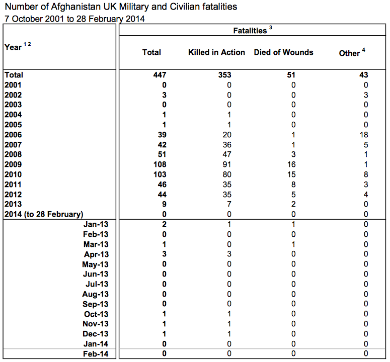 In addition, the war in Afghanistan has cost the United Kingdom at least £37 billion pounds including military costs of £31.1 billion, veterans' costs of £3.8 billion and civilian development costs of £2.1 billion. Between October 7, 2001 and February 28, 2014, the following United Kingdom military and civilian casualties took place in Afghanistan: