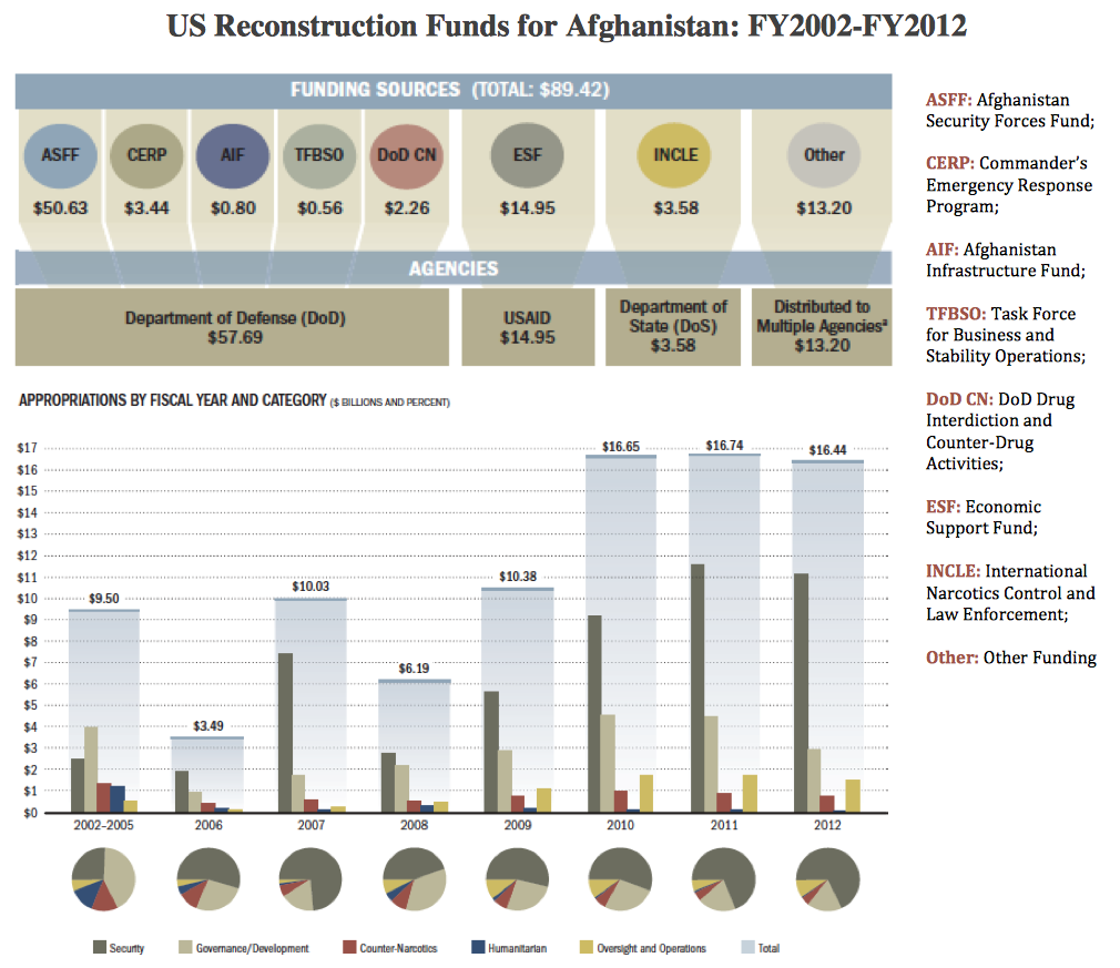 According to the National Priorities Project, every hour, American taxpayers are paying $10.17 million for the cost of "Operation Enduring Freedom" in Afghanistan with the total spent now in excess of $707.6 billion. Here is a graph showing the total spending on the wars in Iraq and Afghanistan between fiscal 2002 and fiscal 2012 according to a 2013 analysis by the for Strategic and International Studies: