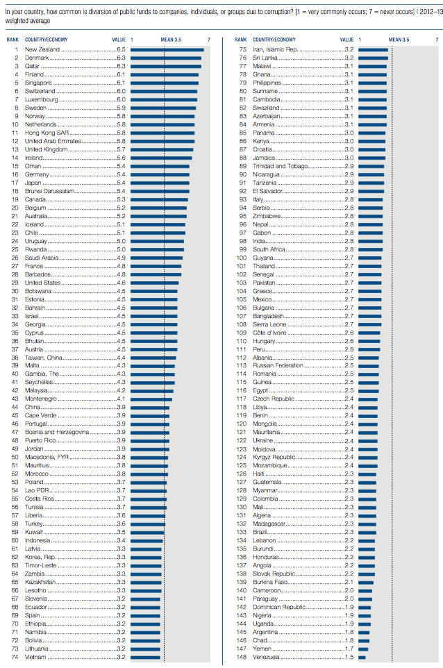 Here is how America compares to its peers when it comes to corruption (i.e. the diversion of public money to companies, individuals or other groups), keeping in mind that a score of 7 means that corruption does not occur and 1 meaning that it occurs all of the time: