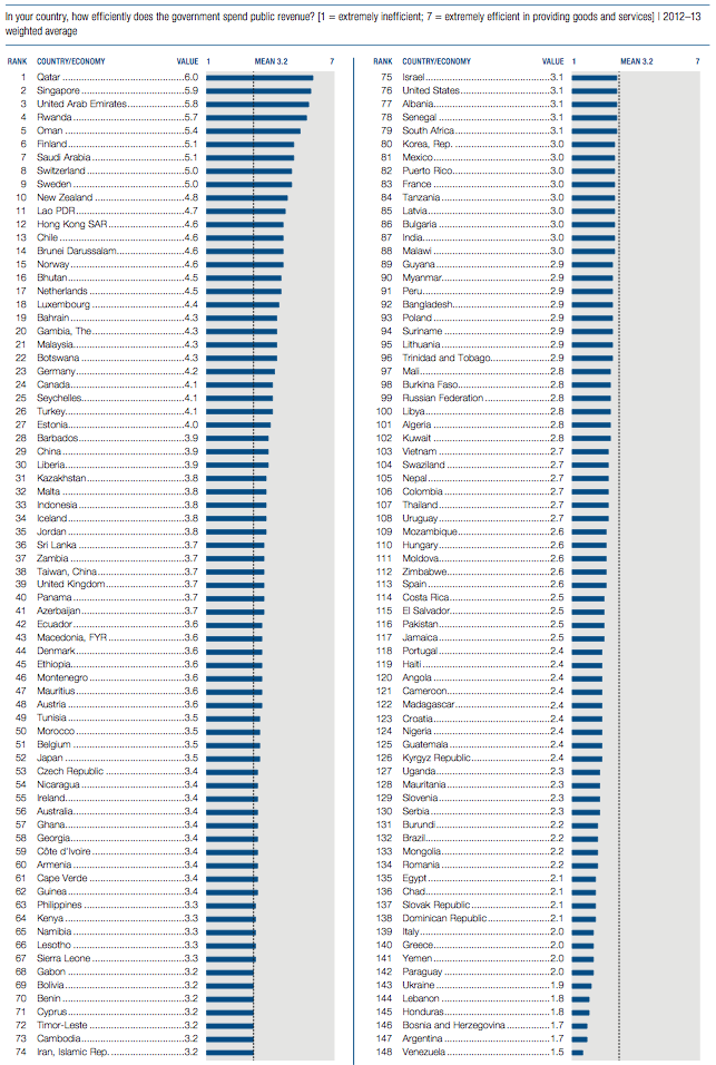 In this metric, the United States comes in with a ranking that puts it in the bottom half of the 148 country sample, scoring 3.1 which puts it in 76th place, tied with nations including Iran, Albania and Senegal. By way of comparison, Canada comes in 24th place with a score of 4.1 and the United Kingdom comes in 39th place with a score of 3.7. Apparently, the degree of ineffective spending by governments in the United States is of great concern to America's executives.