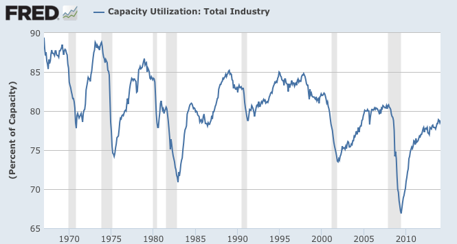 Capacity utilization hit a low of 66.9 percent in June 2009 after falling from a pre-Great Recession peak of 80.8 percent in December 2007. Since June 2009, capacity utilization has risen steadily, first at a rather rapid rate until September 2010 when it hit 75.4 percent, an increase of 8.5 percentage points over a 16 month period and then more slowly, taking 40 months to rise by 3.4 percentage points to February 2014's level of 78.8 percent.