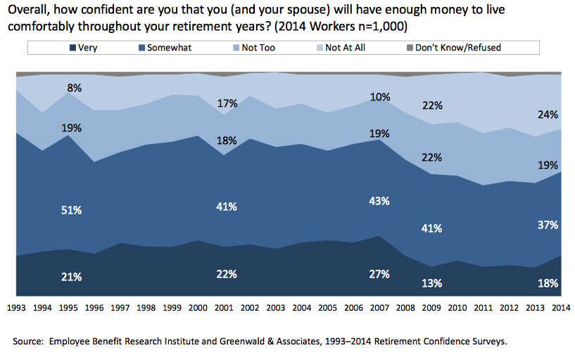 2.) Only 18 percent of workers believe that they are confident that they will have enough money for a comfortable retirement. While this is up from 13 percent in the previous year, it is down from levels between 1993 and 2007 as shown in dark blue on this graph: