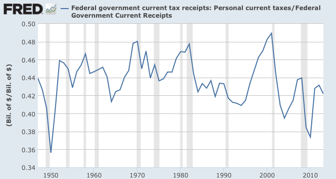 In contrast, here's what has happened to personal income tax revenue as a percentage of total federal tax receipts since 1947: