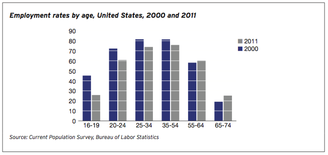 In the case of 16 to 19 year olds, employment rates fell from 45 percent in 2000 to 26 percent in 2011, a 19 percentage point decline. In the case of 20 to 24 year olds, employment rates fell from 72 percent in 2000 to 61 percent in 2011. In contrast, employment rates for workers 55 years and older rose by between 2 and 6 percentage points depending on age.