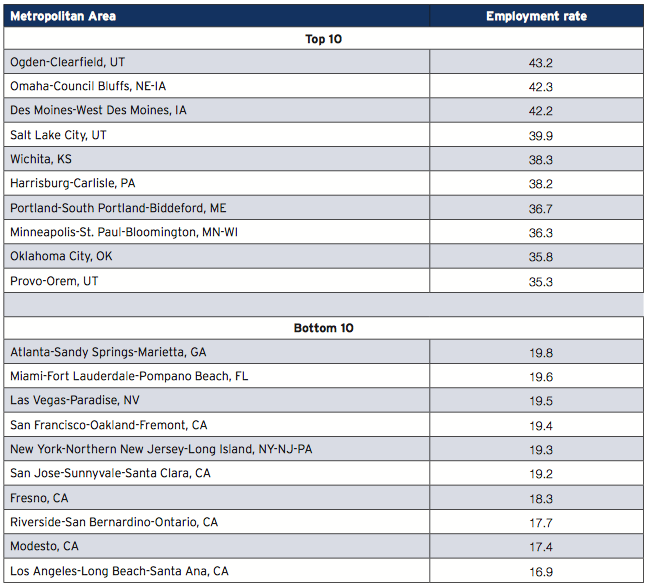 Here is a chart showing the metropolitan areas with the highest and lowest teen employment rates: