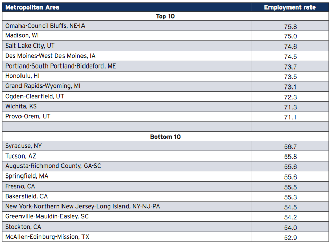 Here is a chart showing the metropolitan areas with the highest and lowest young adult employment rates: