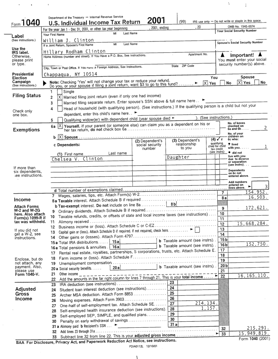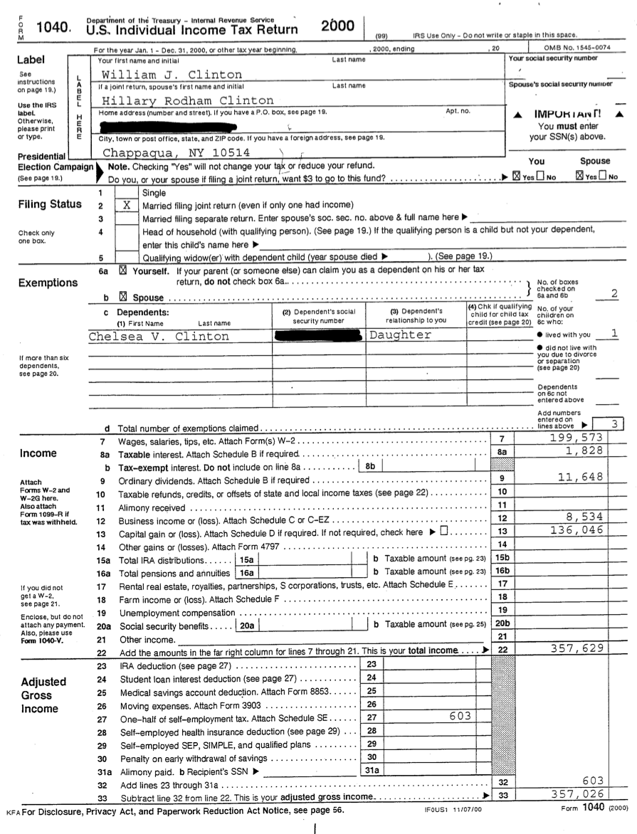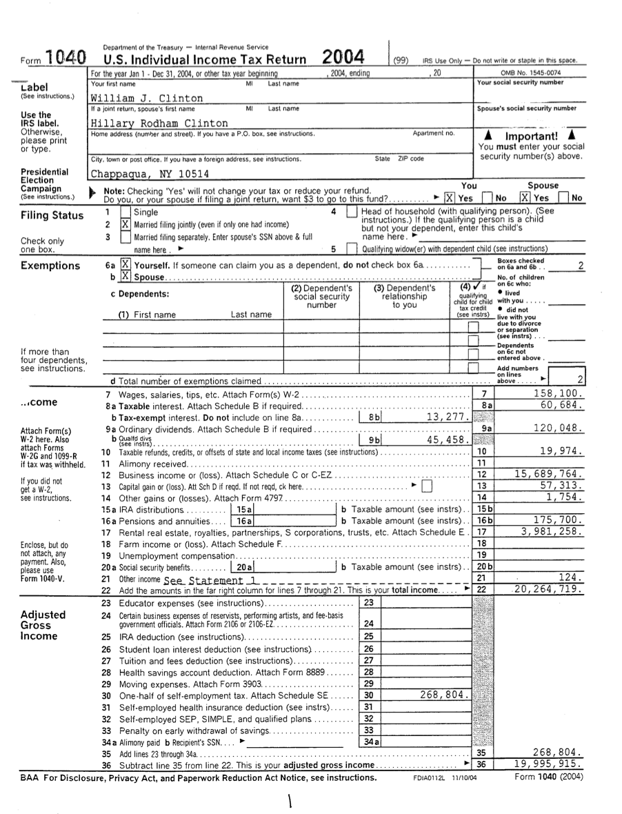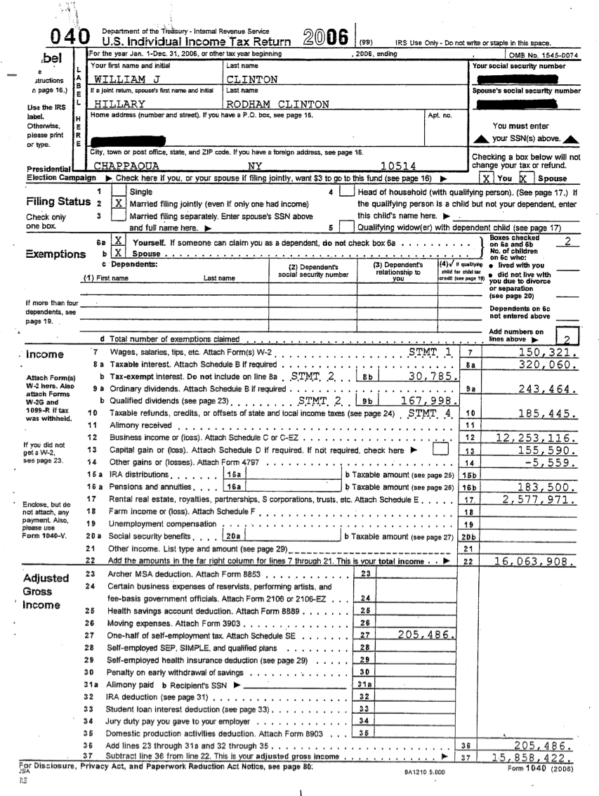 Again, according to Ms. Clinton's tax releases for 2000 to 2006, over that time frame, the Clintons made $109.2 million in income and paid $33,783,507 in taxes and donated $10,256,741 to their family foundation. Over the seven year period, President Clinton's Presidential Pension paid him $1,217,250, he made $29,580,525 from book sales and an additional $51,855,599 from public speaking. Interestingly, in 2007, You can find the returns here. Just for fun, here is page one from their joint 1040 showing their income stream for the tax years from 2000 to 2006:
