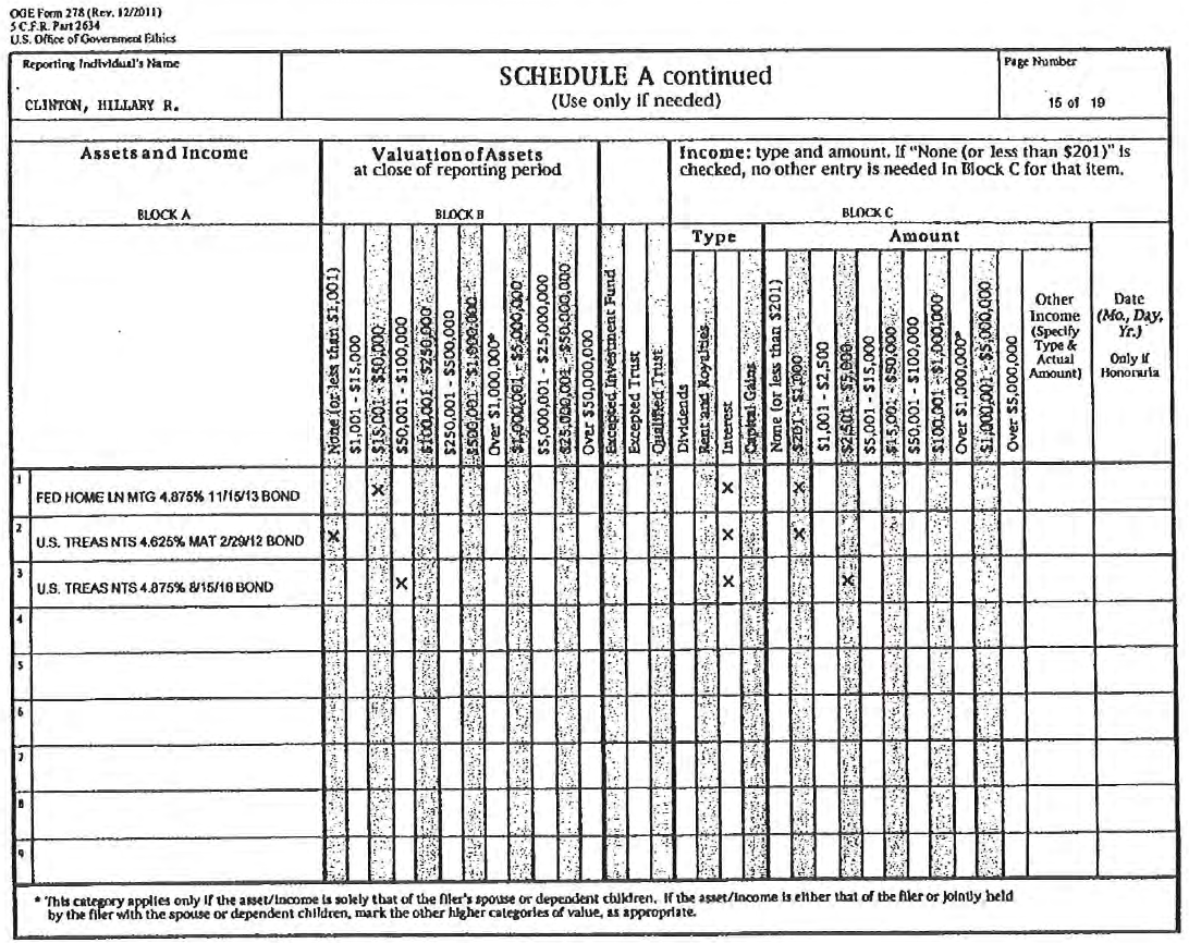 The Clintons also disposed of their holdings in three Dreyfus bond funds that were inherited, worth between $15,001 and $50,000 each. As well, they have United States Treasury notes worth between $50,001 and $100,000 as shown here: