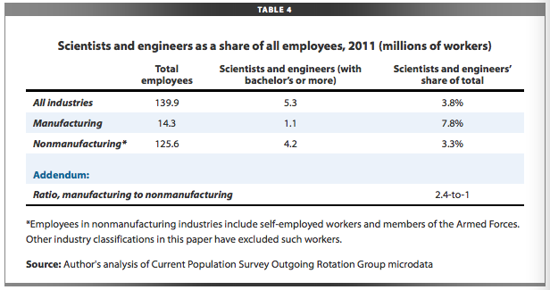 5.) While we tend to associate manufacturing jobs with lower levels of education, in fact, scientists and engineers make up 7.8 percent of workers in the manufacturing sector, more than twice the level of 3.3 percent in the rest of the economy as shown on this table: