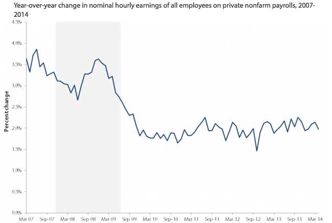 In Q1 of 2008, the real wage index read 99. Six years later in Q1 2014, the real wage index read 100.7. That's an increase in after-inflation hourly compensation of 1.7 percent over six years. And central bankers wonder why our consumer-driven economy is flatlining.