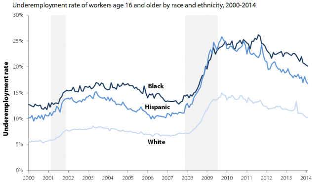 Five years into the "recovery" and all three groups have not seen their underemployment rate drop to pre-Great Recession levels. In the case of blacks, their underemployment rate is still a very high 20 percent and the underemployment rate for Hispanics is not much better at 18 percent.