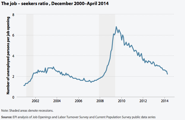 April 2014's level of 2.2 job seekers per job is well down from the peak of 6.8 in July 2009 but is still the highest level since November 2004, nearly a decade ago.
