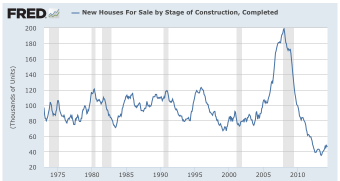 Obviously, home builders are limiting their exposure to risk by reducing the number of spec built homes. In May 2014, there were only 46,000 completed new homes that were for sale. This is less than one-quarter of the 199,000 completed homes that were for sale in January 2008 and is well below levels seen going all the way back to 1973 when there were between 80,000 and 104,000 completed units for sale and the population of the United States was only 212 million, one-third smaller than it is today.