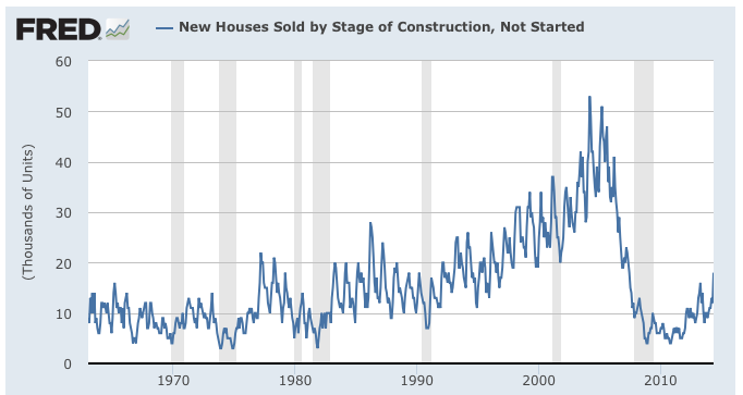 In mid-2014, there were only 18,000 homes in the United States that had been sold but not under construction. This is down from a peak of 53,000 in March 2004 but up from a low point of only 4,000 in December 2008. We have to go all the way back to early 1997 to see such a low level of pre-sold, unbuilt housing.