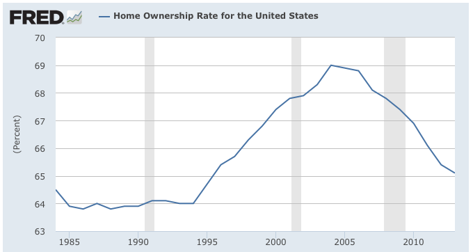 Here is a graph from FRED showing the level of home ownership in the United States from the years 1984 to the present: