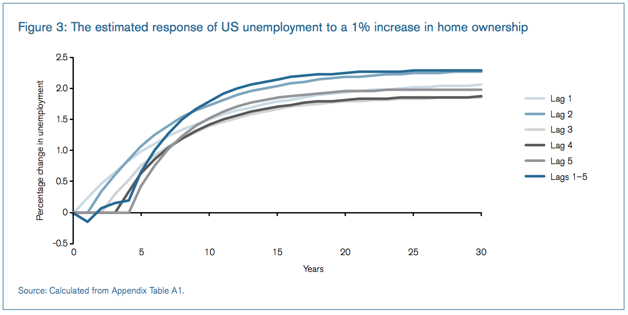 The authors conclude that policies that promote home ownership have resulted in an impairment of the labour market over an extended period of time. They suggest that the reason that this pattern has received relatively little attention is that the time lag between a rise in the level of home ownership and the time that the labour market is impacted is relatively long, leading to relatively little research on the subject. The conclusions of this research is particularly important for policy-makers, both government and in the world's central banks who seem at a bit of a loss when it comes to understanding why unemployment has remained at elevated levels since the end of the Great Recession.