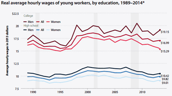 1.) Lower wages – since 2000, the inflation-adjusted wages of young high school graduates have dropped 10.8 percent and those of young college graduates have dropped 7.7 percent. Here is a graph showing what has happened to real hourly wages for young workers by education level and gender since the late 1980s: