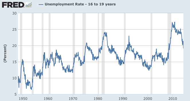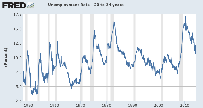 The unemployment rate in July 2014 for workers under the age of 25 was 11.3 percent, nearly double the overall U-3 unemployment rate of 6.2 percent. While one might assume that with job prospects being poor, young Americans are heading to higher education in droves, such is not the case; since 2012, college enrolment rates have actually dropped slightly as shown here: