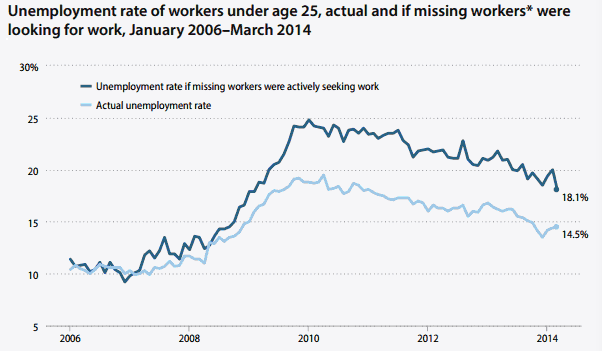 These "missing workers" are potential workers who are neither employed nor actively looking for work and fall outside of the Bureau of Labor Statistics' official definition of "the unemployed". The high number of missing workers is a result of poor job market opportunities; between 2007 and 2010, there were as many as 1.6 million missing workers. If these missing workers were included in the labor market, the unemployment rate of workers under the age of 25 would be 18.1 percent rather than the current rate of 14.5 percent.