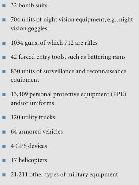 1.) The Department of Defense's 1033 Program which has transferred $4.3 billion worth of Department of Defense surplus property to more than 17000 federal and data law enforcement agencies across America. In 2013 alone, nearly $450 million worth of property was transferred. As an example, Gwinnett County in Georgia received at least 57 semi-automatic M-16s and M-14s as well as Kevlar helmets and vests in 2011 – 2012. North Little Rock police in Arkansas revved at least 34 automatic and semi-automatic rifles and two MARCbot robots that were designed for use in Afghanistan and can be used to identify potential explosives/IEDs. Each system costs around $10,000 but was free to the North Little Rock police. Here's a list of the items received by Maricopa County, Arizona, mainly through the 1033 Program:
