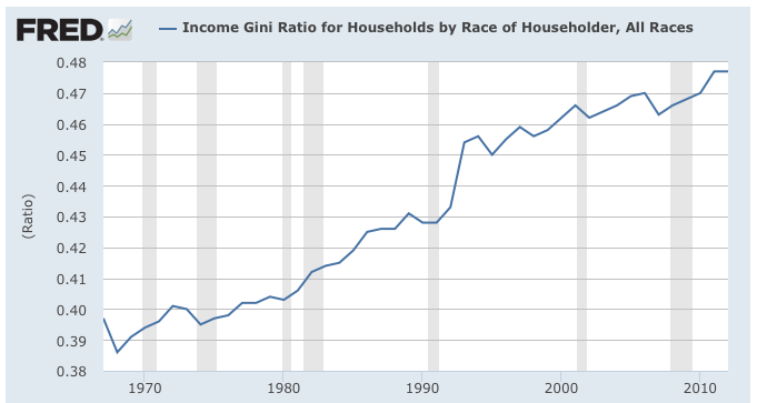 The Gini Ratio is a measure of income inequality. Basically, it measures income distribution of a country's residents, defining the gap between the rich and poor of a nation with a higher number representing a greater degree of income inequality. Here is a graph showing the Gini Ratio for the United States since 1967: