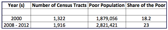Here is a chart showing the distressed neighbourhood statistics (more than 40 percent poverty rate) for the urban poor for both 2000 and the period between 2008 – 2012: