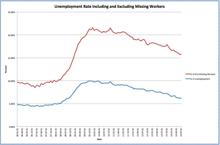 In July 2014, rather than the 6.2 percent headline U-3 unemployment rate, if we add in missing workers, the unemployment rate jumps to 9.6 percent as shown on the red line. On top of that, if we were to add in the workers that are marginally attached to the workforce plus the workers that are working part-time for economic reasons as included in the broader U-6 measure, you can see that we would have a real world unemployment rate in excess of 15 percent.