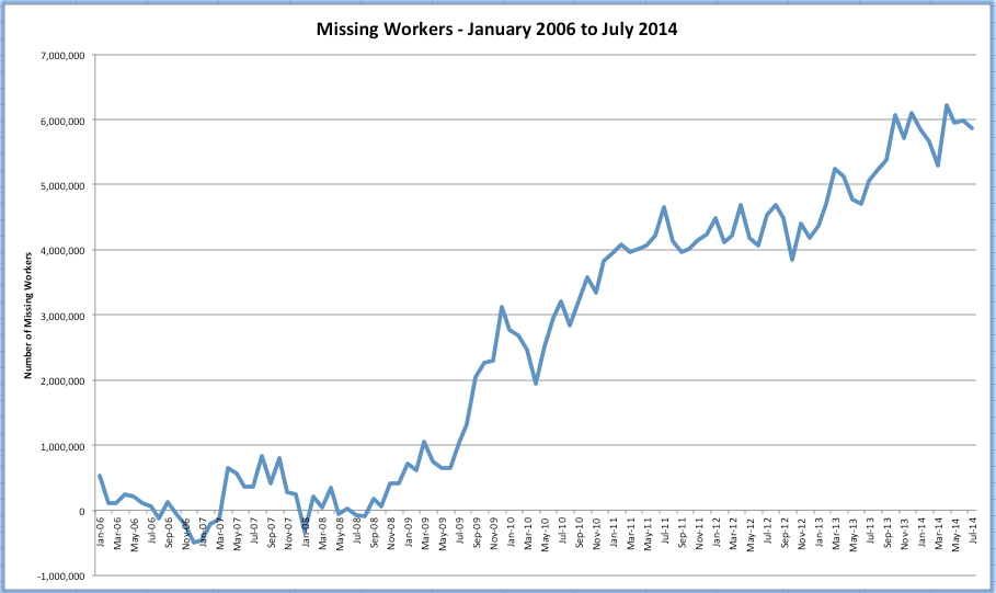 EPI calculations show that there were 5.86 million missing workers in July 2014, among the highest levels since the Great Recession.